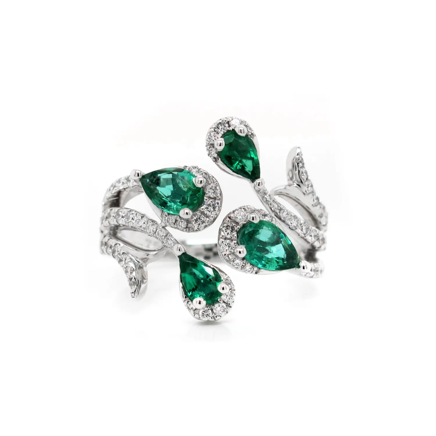 This gorgeous emerald and diamond ring has a unique design that you will get compliments when you wear it. There are 4 pear shape Emeralds that weigh approximately 1.02 carats and round diamonds that weigh approximately 0.57 carats. This ring is set in 18k white gold.