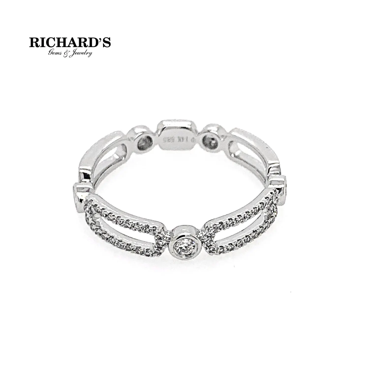 Open link diamond ring set in 14k white gold with approx. 0.10 round diamonds. Perfect for everyday use, can be worn alone or with other trendy rings.